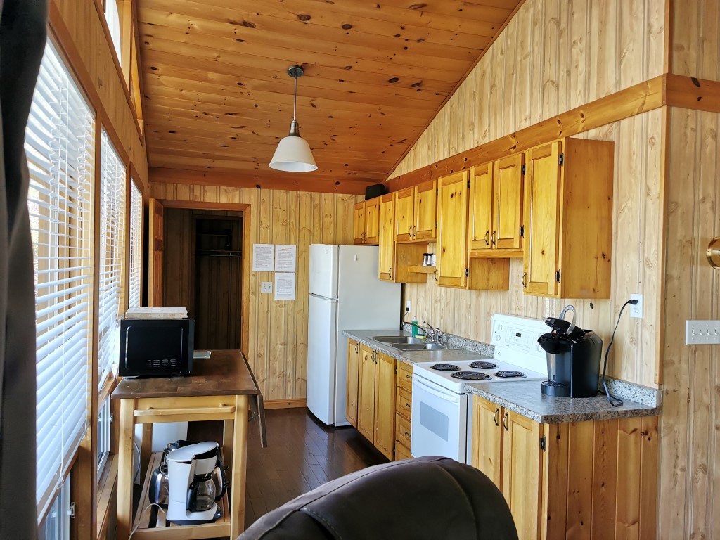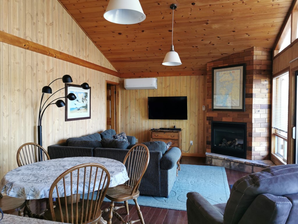 Chalet style 3 bedroom executive cottage with a queen, 2 double, and 1 single bed. It also features a Keurig and drip coffee maker, 3 piece bath with separate vanity area, fireplace and air conditioning. Stunning view from your private rock top sitting area or from the extra large deck. This cottage is also available for winter rental. Max. occupancy 6 persons.